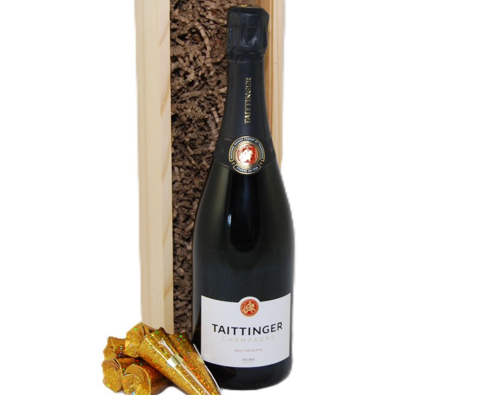 One bottle (75cl) with party poppers presented in a high quality wood gift box with a sliding lid. Your message is handwritten in gold ink on a card and placed with your gift.